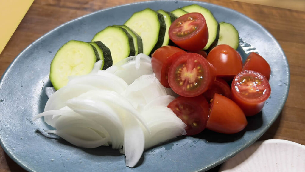 ■ズッキーニ:5㎜~1㎝程度の厚さの輪切りにする。